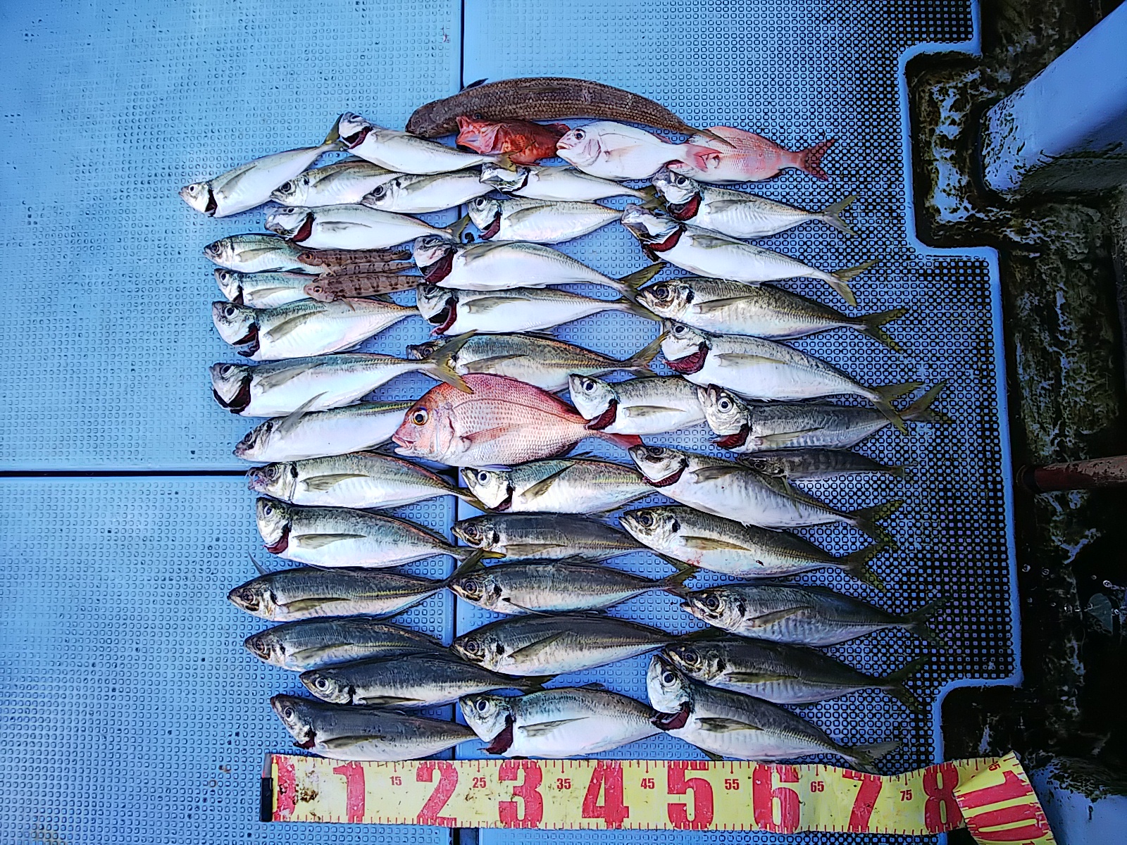 マダイ1匹・33センチ[タイカブラ]/マアジ41匹(25センチ~36センチ)坊主なし/ガシラ1匹・19センチ/チャリコ2匹(22センチ・23センチ)/トラギス3匹(14センチ~18センチ)/エソ1匹・44センチ