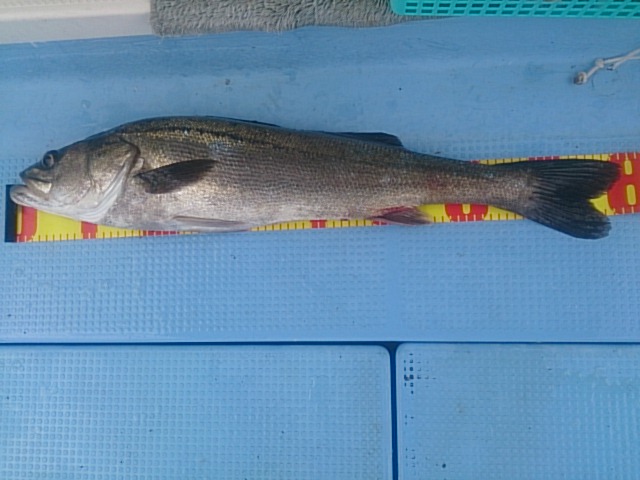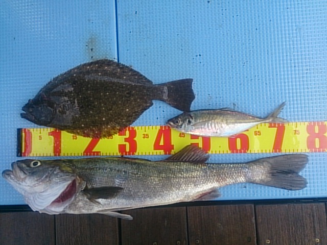 釣果 ヒラメ1匹・50?(タイカブラ)/スズキ1匹・80?(ノマセ)/マアジ1匹・34?