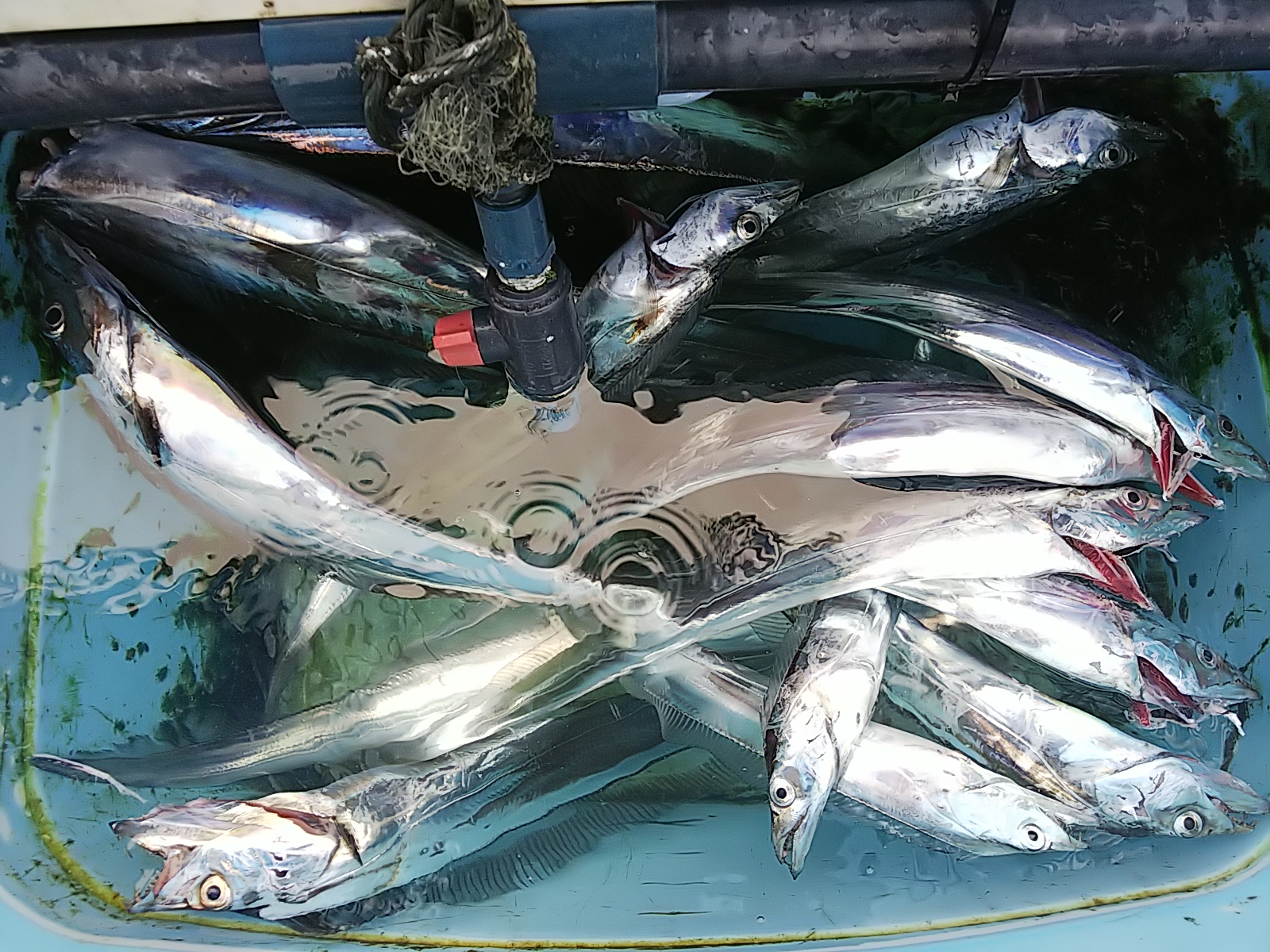今日は、昨日に比べると前半風波なく穏やかでしたが、8時以降ウネリ出てきて台風の影響出てくる中、タチウオ主に個々に好き勝手遊んで貰い、マアジの顔も見れて良かったです(^^)