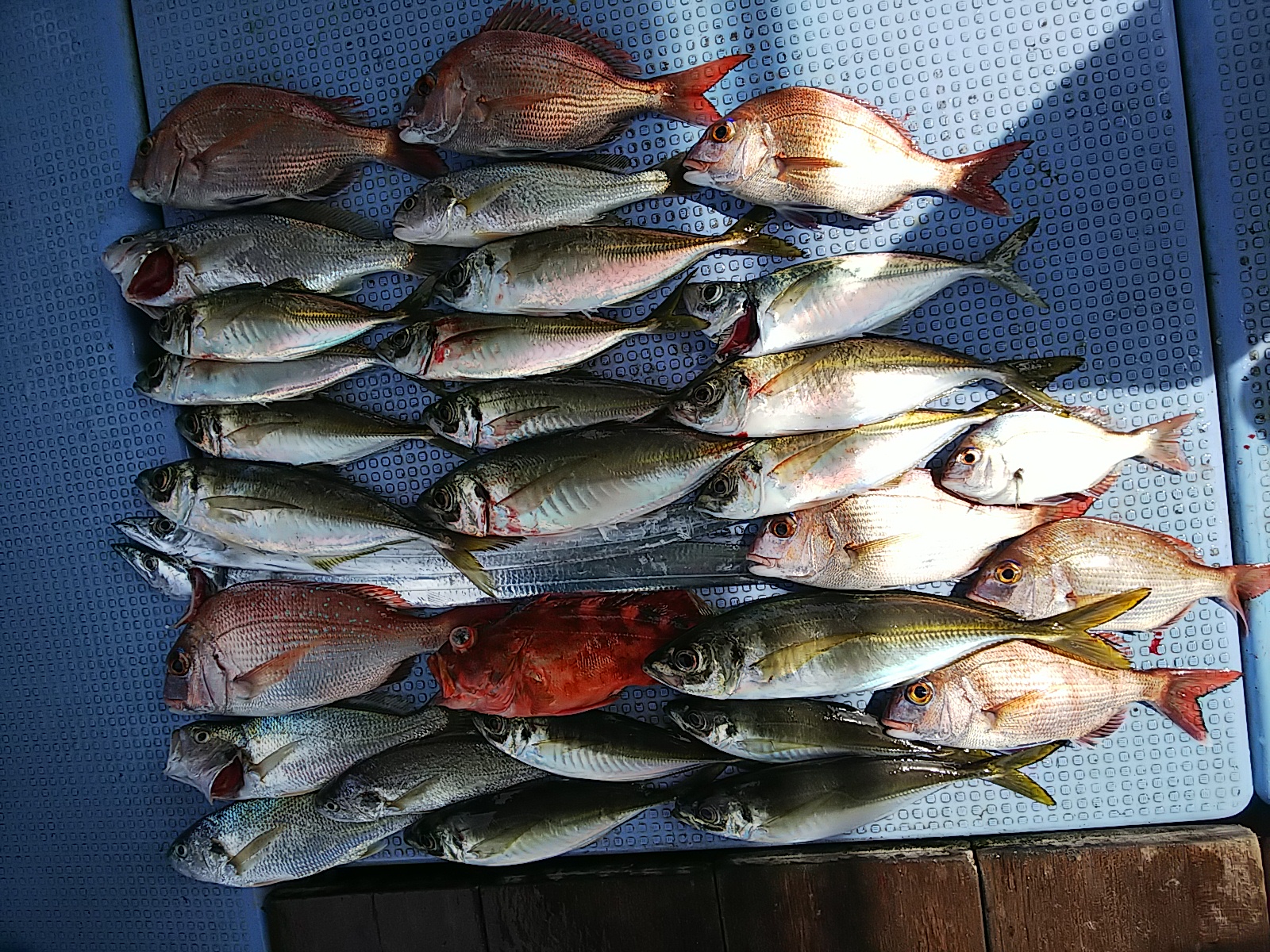 タチウオ2匹(70センチ・74センチ)[タイカブラ]/マアジ16匹(24センチ~34センチ)坊主なし/マダイ1匹・32センチ[胴付き仕掛け]/チャリコ3匹/カスゴ3匹/イシモ5匹(24センチ~25センチ)/ガシラ1匹・27センチ