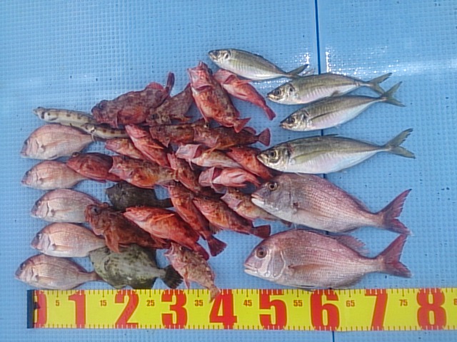 釣果 マダイ2匹(34?・35?)/マアジ4匹(22?〜32?)/ガシラ20匹(15?〜23?)/チャリコ5匹 (19?〜23?)/トラギス2匹(15?〜18?)/カワハギ2匹(16?・21?)