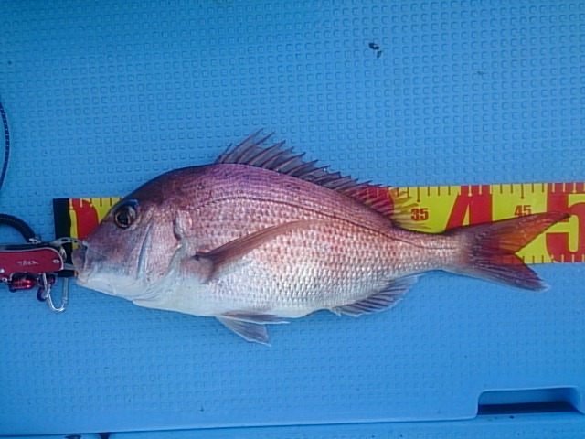 朝から餌取り多く苦戦したので、思い切ってワーム(疑似)に代えて釣りしたら、マダイ50?釣れました!