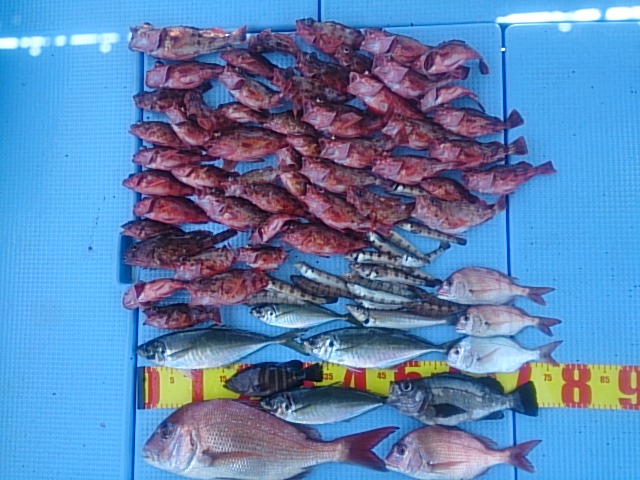釣果 マダイ1匹・50?【ワーム(疑似)】/メバル1匹・27?/マハタ1匹・19?/マアジ4匹(23?〜25?)/ガシラ51匹(15?〜25?)/チャリコ3匹 (15?〜22?)/カスゴ1匹・29?/キス1匹・22?/トラギス18匹(11?〜18?)