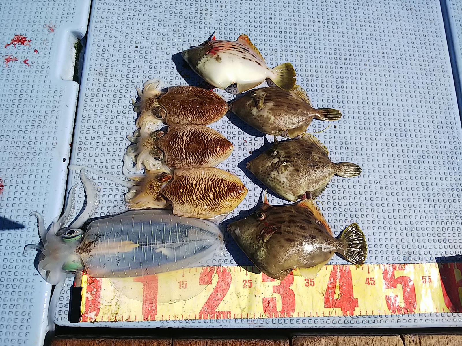 カワハギ4匹(20センチ~25センチ)[カワハギ仕掛け]/アオリイカ1杯・胴長23センチ[バーチカル]/コウイカ3杯(胴長12センチ~14センチ)[バーチカル]