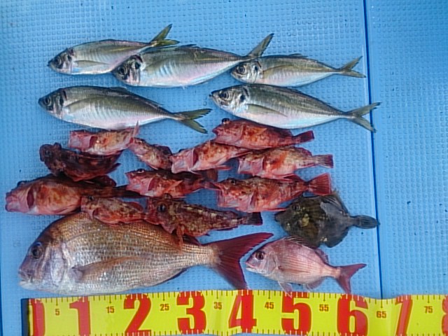 釣果 マダイ48匹・1?/マアジ5匹(25?〜35?)/ガシラ11匹(15?〜27?)/チャリコ1匹・22?/カワハギ1匹・20?