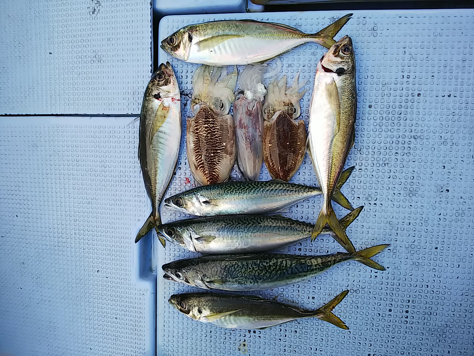 マアジ4匹(35センチ~36センチ)[ジグ]/マサバ3匹(37センチ・40センチ・43センチ)/コウイカ2杯(胴長14センチ・胴長15センチ)[バーチカル]/アカイカ1杯・胴長17センチ[バーチカル]