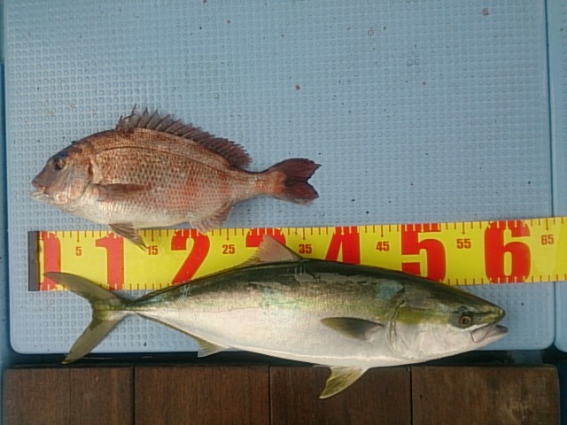 ハマチにタイ 2013年7月29日 今日は朝から雨パラツキ涼しい1日でした。 ノマセ主でやり、何とか赤青釣れて良かったです。 7月29日(月) 雨 小潮 波なし 海水温26℃ 釣り人 小田様、大門様 釣果 ハマチ1匹・60?(ノマセ)/マダイ1匹・38? 仕掛け 胴付き3本針 餌 青イソメ 仕掛け、ノマセ仕掛け 餌 活きアジ 久しぶりの釣り楽しんでくれましたか? またチャレンジしましょう! 本日は、ありがとうございました。