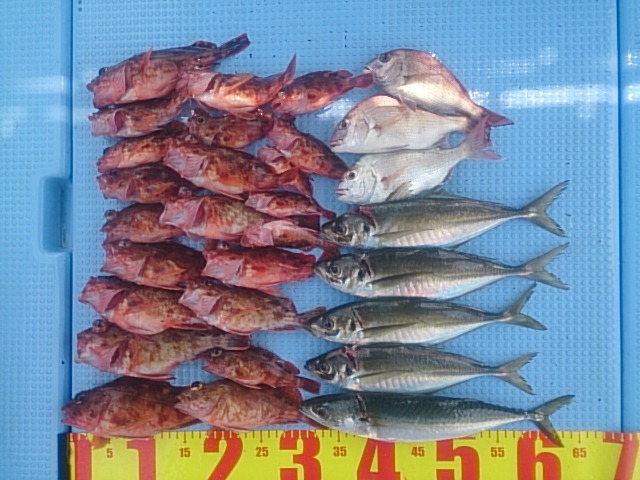 釣果 マアジ4匹(30?〜33?)/マサバ1匹・35?/ガシラ22匹(13?〜23?)/チャリコ3匹(20?〜22?)