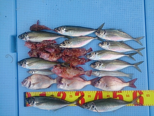 釣果 マアジ8匹(25?〜34?)/マルアジ2匹(29?・32?)/ガシラ8匹(15?〜23?)/チャリコ3匹(23?〜25?)/キス2匹(20?・23?)
