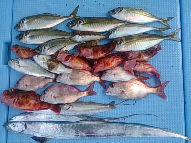 釣果 タチウオ3匹(53?〜87?)【タチウオテンヤ】/マアジ4匹(27?〜30?)/マルアジ2匹(31?・33?)/ガシラ7匹(15?〜25?)/イシモチ2匹(21?・25?)/チャリコ5匹(20?〜25?)/キス1匹・23?/トラギス3匹(14?〜15?)