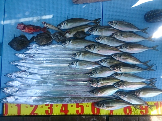 釣果 カワハギ4匹(13?〜20?)【カワハギ仕掛け】/タチウオ12匹(70?〜100?)【タチウオテンヤ 】/マアジ32匹(25?〜32?)/ガシラ1匹・21?/トラギス1匹・18?