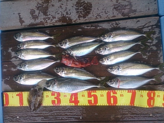 釣果 コウイカ1杯・胴長15?【エギ】/1匹・21?/マアジ14匹(28?〜38?)