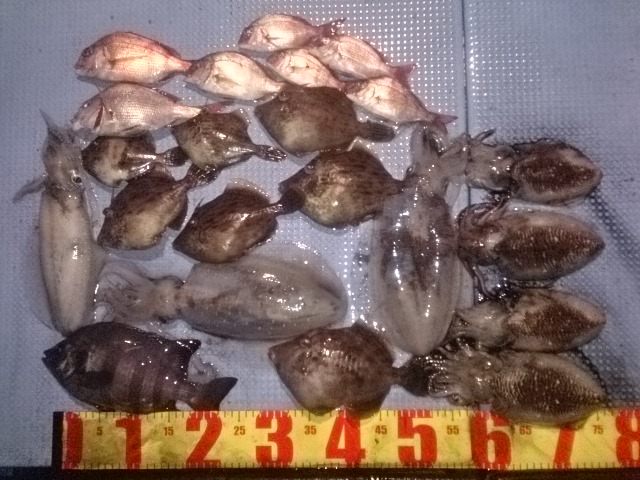 釣果 アオリイカ3杯(胴長22?〜26?)【エギ】/コウイカ4杯(胴長14?〜18?)【エギ】/カワハギ7匹(18?〜25?)/サンバソウ1匹・30?/チャリコ7匹(16?〜25?)