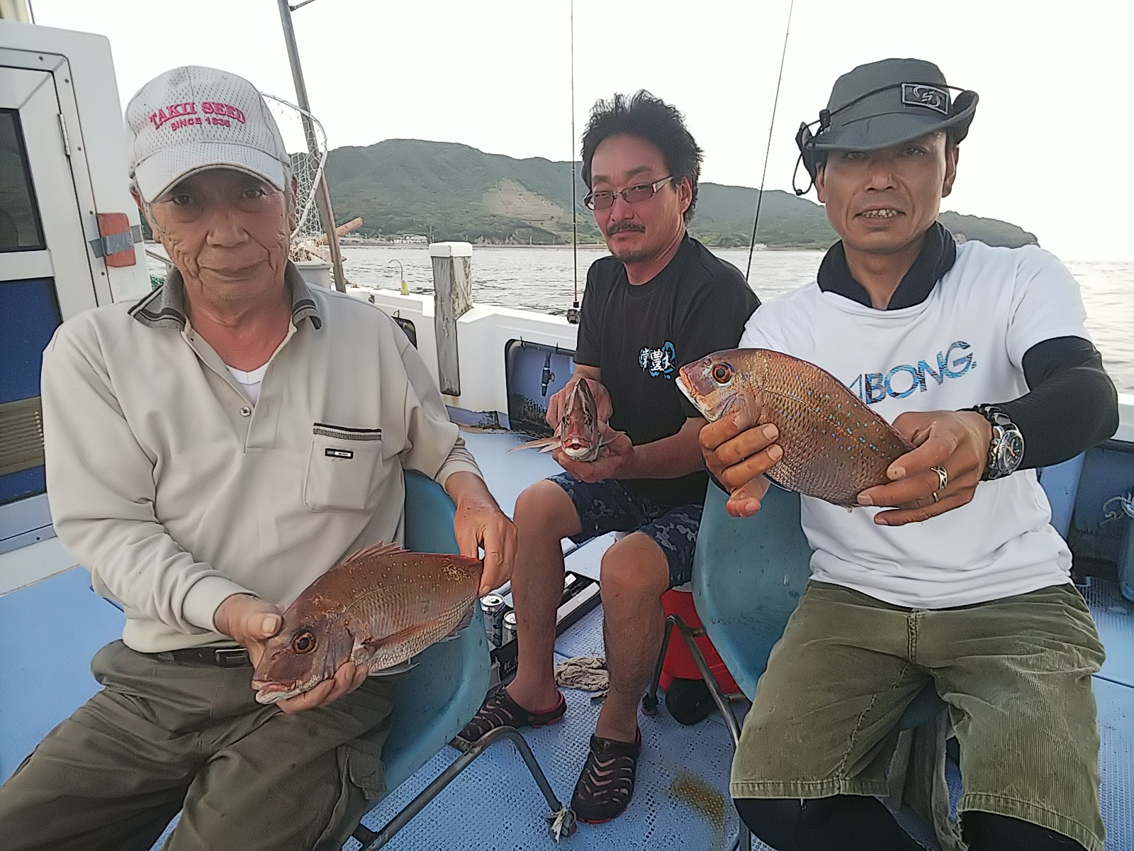 今日は、午前お客さんの希望でタチウオ狙いに、淡路沖、友ヶ島沖攻めましたが、皆目アタリなく撃沈に近い結果に終わりました(TдT) 午前のお客さんごめんなさいね(TдT) そんな結果でしたので、午後からもタチウオする予定でしたが、止めてタイカブラと五目釣りしてもらいました(^^)/ タイカブラ全員安打出来て良い土産なりました(^^) 8月14日(月)晴れ 小潮 波なし 海水温26℃ 釣り人 的場御家族様 仕掛け 胴付き仕掛け 餌 青イソメ 仕掛け 餌 …