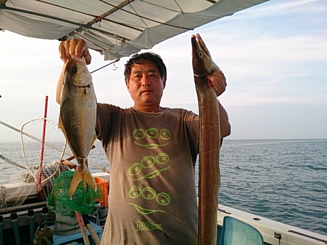 今日も昨日同様タチウオ狙い、昨日より食い気あり、地合いに入ると入れ食い状態で型も全員メーターオーバー釣られ良い土産出来ました(^_^)v タチウオ楽しまれてから、落とし込みでシオにアコウ釣れて良い土産になりました(^^) 9月16日(金)晴れ 大潮 波なし 海水温25℃ 釣り人 松下様、清野様、小林様 釣果 タチウオ全員メーターオーバー釣られました。各自クーラー入れられたので数え切れませんでした(71センチ~104センチ)[タチウオテンヤ …