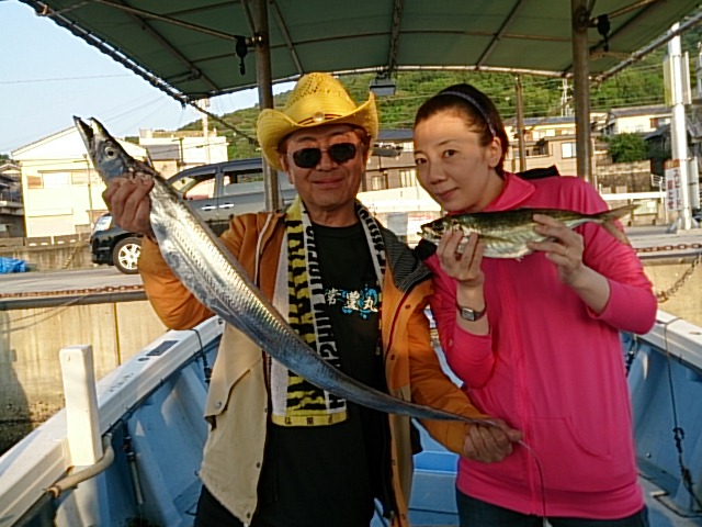 午後は、五目釣り楽しんでもらいました(^^) 今日は、1日天気良く釣り日和で良かったです(^^) 今年初の40センチ良型マアジ釣れました(^^) これから徐々に釣れ出して来るでしょう(^o^)v おまけに胴付き仕掛けに120センチのドラゴンタチウオ釣れて良い土産なりました(^^) 5月14日(土)晴れ小潮 波なし 海水温17℃ 釣り人 出井様、大門様、岡田様、嶋村様 釣果 マアジ1匹・40センチ/タチウオ1匹・120センチ[胴付き青イソメ]/ガシラ7匹/ チャリコ11匹 仕掛け 胴付き2本針 餌 …