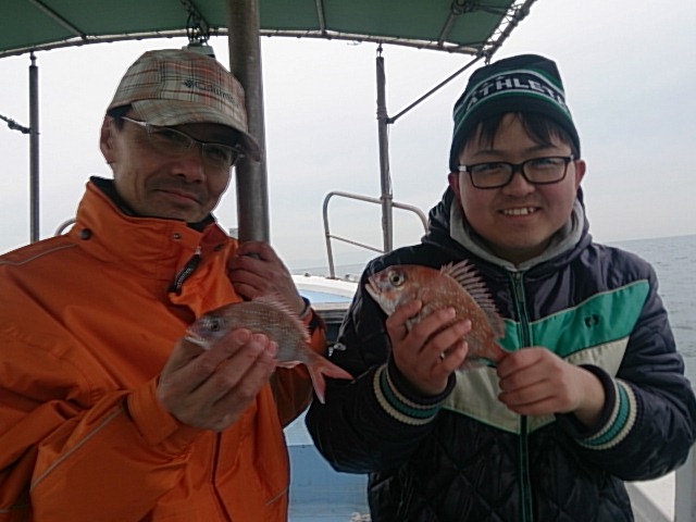 今日は、穏やかな釣り日和でした(^^) お父さんタイカブラ、子供さん、五目釣り楽しんでもらいました。 3月16日(水)曇り 小潮 波なし 海水温12℃ 釣り人 中谷親子様 釣果 チャリコ1匹[タイカブラ]/チャリコ1匹 仕掛け 胴付き2本針 餌 色々 仕掛け 餌 タイカブラ 中谷さん、チャリコですが、タイカブラ釣れて良かったですね(^^) 圭吾君、お父さんより大きいの釣れて良かったですね(^^) また、連れてきてもらって下さいね(^^) 本日は、ありがとうございました(^^) …