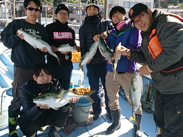 今日は、寒気の影響で明け方まで風強く出れるか心配でしたが、何とか風落ち着いてくれて出ること出来ました(^^) 五目釣り、ノマセ、ジグ、バーチカルで遊んでもらい、珍しくバーチカルでアカイカ乗ったり、ここ数週間マアジの姿ありませんでしたが、マアジの顔も少し見ることが出来て良かったです(^^) ノマセは今日も坊主なく全員釣れて、良い土産なりました(^o^)v 11月11日(水)晴れ 大潮 波高い 海水温20℃ 釣り人 宇井様、中西様、乾様、塩田様、竹永様、福西様 釣果 メジロ10匹(57センチ~67センチ)[ノマセ 内ジグで1匹 …