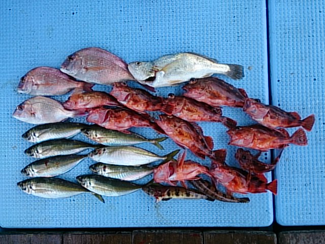 8時頃まで雨で、その後晴れてくれて、風波もなく釣りしやすかったです。 今日も、五目釣り楽しんでもらいました(^^) 6月12日(金) 雨/晴れ 若潮 波なし 海水温20℃ 釣り人 岡留様、内山様、菅様、西島様、岩佐様、西岡様、野口様、安原様 釣果 アコウ1匹・20センチ[胴付き3本針仕掛けの青イソメ]/マアジ12匹(23センチ~35センチ)/ガシラ30匹(17センチ~25センチ)/カスゴ1匹・28センチ/チャリコ12匹(16センチ~19センチ)/トラギス11匹(10センチ~16センチ) 仕掛け 胴付き3本針 餌 …