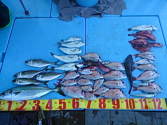 午後からは、少し風波弱まってくれました。 二時間ほどタイラバ頑張ってもらいましたが、反応ないため、諦め五目釣りしておかず持って帰ってもらいました。 6月6日(土) 晴れ 中潮 波少し高い 海水温20℃ 釣り人 宮本様、友田様、一木様 釣果 マアジ&マルアジ4匹(23センチ~32センチ)/ガシラ4匹(16センチ~23センチ)/カスゴ2匹(25センチ・26センチ)/チャリコ3匹(18センチ~20センチ)/イシモチ1匹・23センチ 仕掛け 胴付き3本針 餌 …