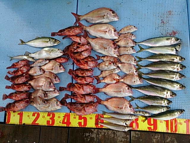 今日は、風波なく暑い1日でした。 ガシラ主に、退屈せん程度に釣れ、おかず確保出来て良かったです(^^) 5月27日(水) 晴れ 長潮 波なし 海水温19℃ 釣り人 尾形様、柏木様、今村様、太田様 釣果 ガシラ21匹(15センチ~23センチ)/カスゴ3匹(25センチ~28センチ)/チャリコ6匹(17センチ~19センチ)/トラギス9匹(12センチ~15センチ) 仕掛け 胴付き2本針 餌 …