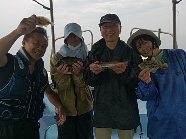 今日は、夜明けから雨降りだし肌寒い1日でした。 雨の中、五目釣り楽しんでもらいました(^^) 二組とも、奥さんの方が良く釣られてました(^^) 5月9日(土) 雨 小潮 波なし 海水温17℃ 釣り人 武田御夫婦様、小村御夫婦様 釣果 メバル1匹・29センチ/キス1匹・25センチ/カワハギ2匹(15センチ・17センチ)/ガシラ11匹(17センチ~23センチ)/カスゴ2匹(25センチ・27センチ)/チャリコ4匹(センチ~センチ)/ガンゾウビラメ1匹・13センチ/トラギス4匹(13センチ~15センチ) 仕掛け 餌 メバル仕掛け 仕掛け 胴付き2本針 餌 …