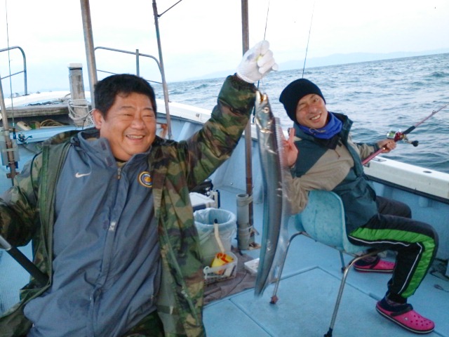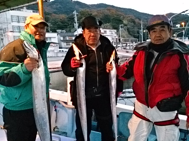 今日は、寒冷前線の影響で荒れるの心配しながら船出しましたが、午前中風波弱く雨だけで良かったです(^^) 今日もタチウオ狙い、昨日、一昨日に引き続き今日も食い良く十分土産確保出来たので良かったです(^^) 尚、明日出船予定でしたが、悪天候の為中止にしました。 12月16日(火) 曇り/夜明けてから雨 長潮 波なし 海水温14℃ 釣り人 綾田様、熊取谷様 釣果 タチウオ33匹(83センチ~110センチ) 仕掛け タチウオテンヤ 餌 イワシ …